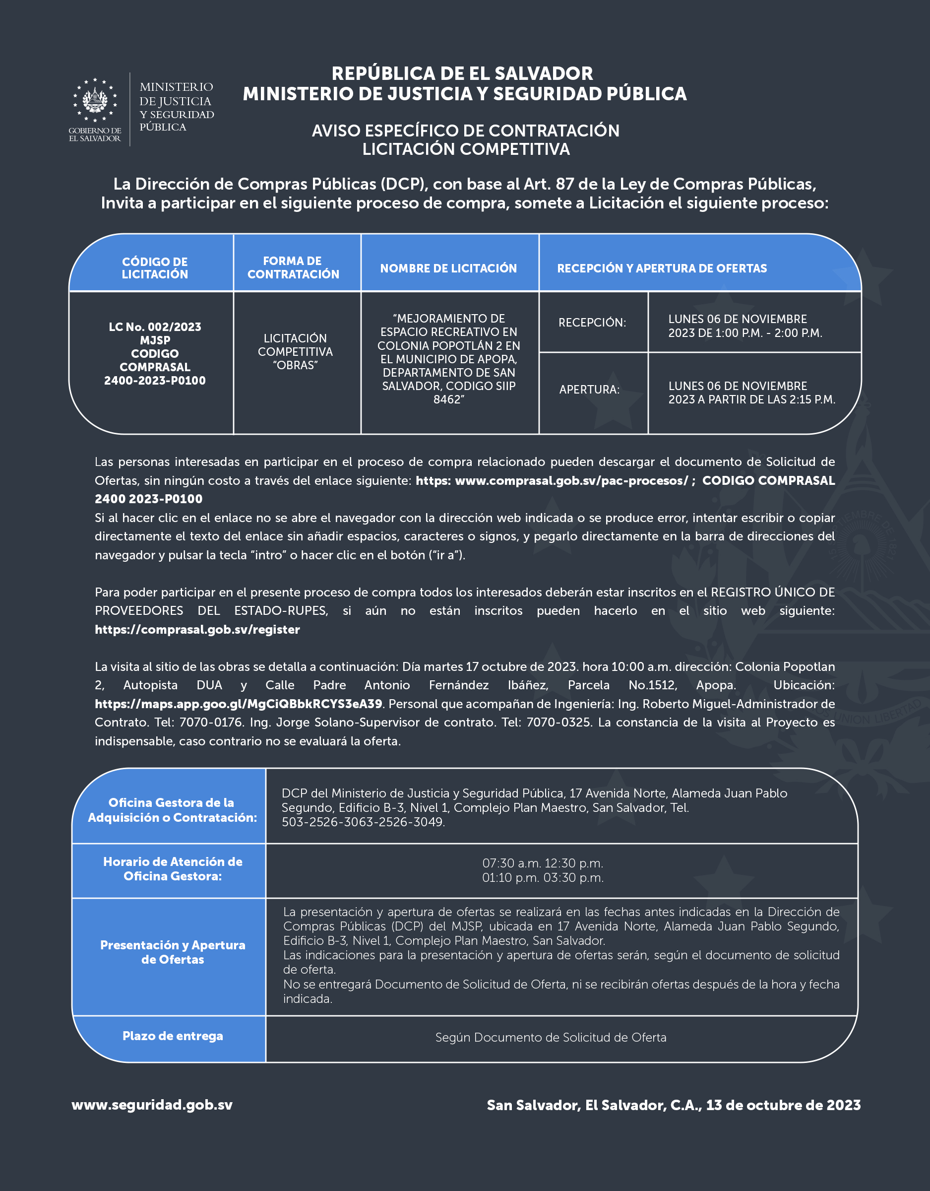 Inicio > Noticias > Invitación a participar en el proceso de licitación de Mejoramiento de espacio recreativo en Col. Popotlán 2, Apopa, San Salvador