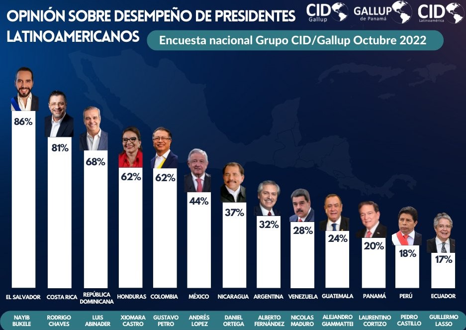 El mandatario salvadoreño tiene un 86% de aprobación entre los presidentes latinoamericanos según el sondeo del mes de octubre.